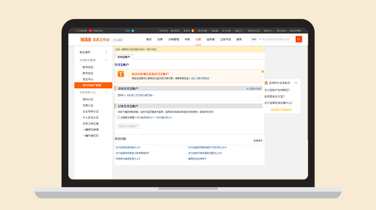 在阿里巴巴的「買家工作台」>「支付寶帳號管理」綁定已使用台胞證實名認證的支付寶帳號。