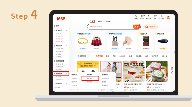 Step.4 等待貨品到達官方集運倉後,點選「跨境服務」>「跨境集運」到官方集運倉。