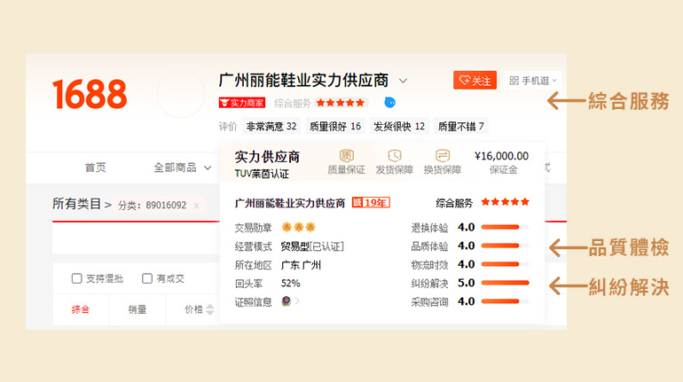 阿里巴巴有一系列相當嚴謹的審核機制,經過1688的深度認證都會有專屬的標章,深度認證可分為深度驗廠及深度驗商,有生產型企業(超級工廠)及非生產型企業(商家),有經過深度認證的商家讓買家更有保障。